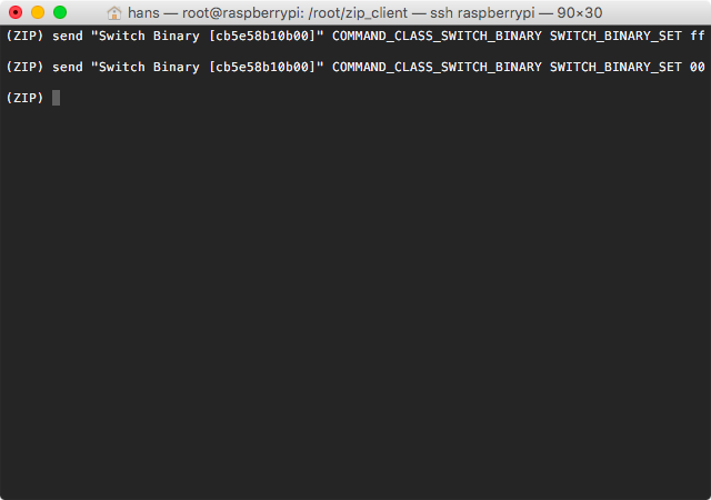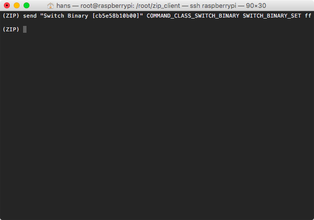 The client will begin negotiating with the Z/IP Gateway, who'll in turn get ready to include a new device. The command doesn't produce any output in the Reference Client's console, but the Z/IP Gateway is now waiting for a new device to request inclusion to the Z-Wave network. Different device manufacturers have different procedures for including their devices, so you'll need to refer to the product manual for the light switch you're using for the correct procedure. Typically, a single- or quick triple-press on their button is what is required to request inclusion.