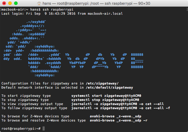 There are many ways to work with the Z-Wave over IP installation. Of course, it is intended to be accessed over the network and from different devices, but for the sake of simplicity, and to help illustrate key concepts, this guide will assume that you are working from within the Raspberry Pi itself. This can be done by either connecting the Pi to a display and a keyboard, or by connecting to it over a secure shell. Users following this guide on macOS or Linux can use the built-in ssh command to connect. Windows users will need an SSH client, like PuTTY (http://www.chiark.greenend.org.uk/~sgtatham/putty/download.html) to connect. To simplify the setup, this guide suggests that you connect the computer you're working from and the Pi to the same Ethernet router - ideally with no other devices in that network.