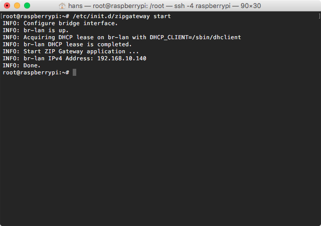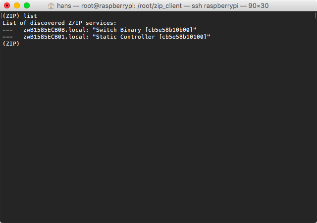 With the Z/IP Gateway now running we can move on to connecting to it with the Reference Z/IP Client. The Reference Z/IP Client needs to be provided the IP address of a Z/IP Gateway to connect to, so the next step is to determine the IP address the Z/IP gateway started above is listening on. The Z/IP Gateway advertises all of the Z-Wave devices it provides connectivity to, as well as itself, over DNS-SD. The Z-Wave Over IP image that you're running has a tool to browse these services called avahi-browse. You can use the tool to locate, and determine the IP address of, all the Z-Wave devices that Z/IP Gateways in your local network are advertising by running: