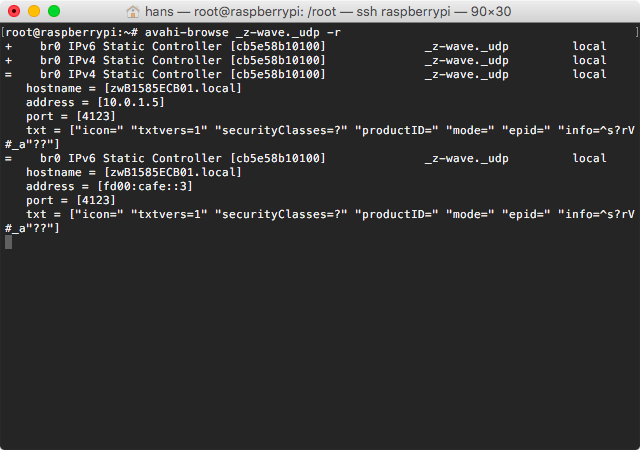 This command continues running in the background, looking for more services, until you stop it with Ctrl+C. In our simple setup, the only advertised Z-Wave device will be the Z/IP Gateway. You may notice that the Z/IP Gateway might have more that one address assigned, and that it uses both IPv4 and IPv6 addresses. For the remainder of the steps, this guide will focus on IPv6. Also note that the advertisements say the devices are listening on port 4123. In reality, all of the services listen on both port 4123 and 41230. Communication with port 41230 needs to be encrypted, while communication with port 4123 happens in the clear but is only available on builds of Z/IP Gateway that explicitly allow non-encrypted communication. The Z/IP Gateway provided in the Z-Wave Over IP image does not allow non-encrypted communication.