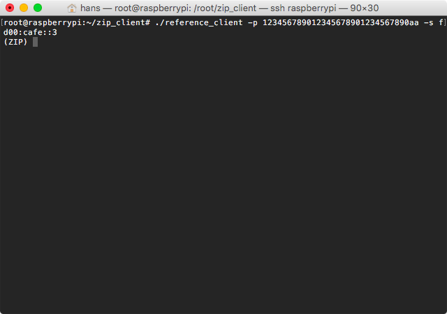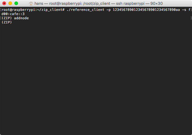 Now that the IP address the Z/IP Gateway is listening on is known the Reference Z/IP Client can be started and instructed to connect to the Z/IP Gateway. Communication with the Z/IP Gateway is protected with TLS, specifically DTLS 1.0. In order to be able to connect to the Gateway, the Reference Client needs to provide a Pre-Shared Key, or PSK for short, in addition to the IP address of the Gateway. The Reference Client expects the Z/IP Gateway to be listening on the default port for Z/IP DTLS communication - 41230. This guide assumes that the Z/IP Gateway is configured to use the default PSK, which is 0x123456789012345678901234567890aa, and that the Gateway is listening on the IPv6 address fd00:aaaa::3.