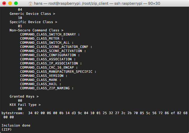 Once the node has been successfully included, the Reference Client will print out a summary of the Command Classes the included device can work with, and some additional information to its console.